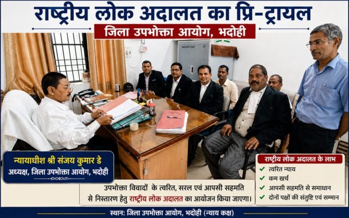 भदोही आगामी राष्ट्रीय लोक अदालत में अधिक से अधिक मामलों के निस्तारण को सुनिश्चित करने के उद्देश्य से आज जिला उपभोक्ता आयोग में प्रि-ट्रायल का आयोजन किया गया।इस अवसर पर उपभोक्ता आयोग के अध्यक्ष/न्यायाधीश श्री संजय कुमार डे ने जानकारी देते हुए बताया कि राष्ट्रीय लोक अदालत का आयोजन 9 मई 2026 को उपभोक्ता न्यायालय परिसर में किया जाएगा।प्रि-ट्रायल के दौरान लंबित मामलों में परिवादी एवं विपक्षी पक्षों को आपसी सहमति से विवादों के समाधान हेतु राष्ट्रीय लोक अदालत के माध्यम से निस्तारण के लिए प्रेरित किया गया।श्री डे ने राष्ट्रीय लोक अदालत के लाभों पर प्रकाश डालते हुए बताया कि इस माध्यम से मामलों का निस्तारण शीघ्र, सरल एवं आपसी सहमति से होता है। इससे दोनों पक्षों का समय और संसाधन बचता है तथा आपसी संबंधों में भी सौहार्द बना रहता है।उन्होंने यह भी बताया कि लोक अदालत के माध्यम से विवाद समाप्त होने पर दोनों पक्षों की संतुष्टि सुनिश्चित होती है और अनावश्यक कानूनी जटिलताओं से भी राहत मिलती है।इस दौरान जिला उपभोक्ता न्यायालय के विश्राम कक्ष में अधिवक्ता शैलेश कुमार दुबे, सत्य प्रकाश पांडे सहित अन्य संबंधित लोग उपस्थित रहे।जिला उपभोक्ता आयोग के रीडर स्वतंत्र रावत ने जानकारी देते हुए बताया कि इस बार राष्ट्रीय लोक अदालत में विशेष रूप से बीमा कंपनियों से संबंधित मामलों के अधिक संख्या में निस्तारण की संभावना है।
