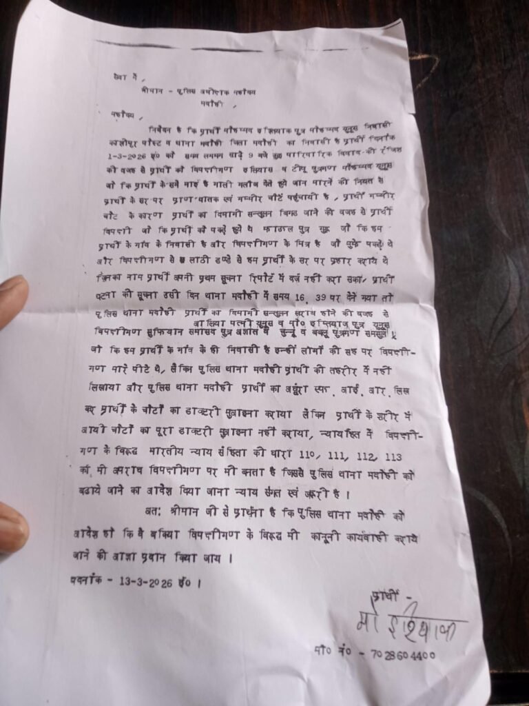 प्रार्थी के अनुसार, 1 मार्च 2026 की शाम करीब 9 बजे गांव के कुछ लोगों ने गाली-गलौज करते हुए उसके घर पर हमला कर दिया और जान से मारने की नीयत से लाठी-डंडों से प्रहार किया। इस हमले में उसे गंभीर चोटें आईं, जिससे उसका संतुलन भी बिगड़ गया। पीड़ित का आरोप है कि हमलावरों में परिवार के ही कुछ लोग शामिल थे, जिन्होंने उसे पकड़कर मारपीट की।