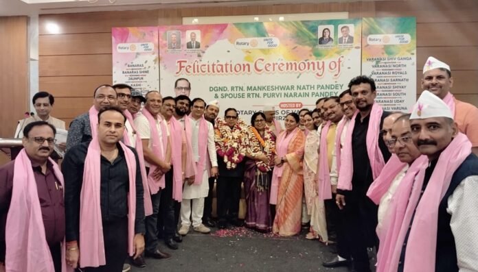 वाराणसी। मलदहिया स्थित एक होटल में रोटरी मंडल 3120 के नवनिर्वाचित मंडलाध्यक्ष (सत्र 2028–29) रोटेरियन मनकेश्वर नाथ पांडे के सम्मान में बनारस एवं मिर्जापुर के सभी रोटरी क्लबों द्वारा संयुक्त रूप से एक भव्य फेलिसिटेशन समारोह का आयोजन किया गया। संयोजक रोटेरियन प्रशांत नागर ने सभी अतिथियों एवं सदस्यों का स्वागत करते हुए कार्यक्रम की रूपरेखा प्रस्तुत की। कार्यक्रम की अध्यक्षता डिस्ट्रिक्ट गवर्नर रोटेरियन डॉ आशुतोष अग्रवाल ने की। समारोह मे रोटेरियन मनकेश्वर नाथ पांडे एवं उनकी धर्मपत्नी पूर्वी नारायण पांडे का अंगवस्त्र एवं स्मृति चिन्ह भेंट कर सम्मान व स्वागत किया गया। इस अवसर पर उपस्थित सभी विशिष्ट अतिथियों का भी सम्मान किया गया। नवनिर्वाचित मंडलाध्यक्ष रोटेरियन मनकेश्वर नाथ ने अपने वीजन के बारे मे सभी सदस्यों को अवगत कराया। समारोह में मंडलाध्यक्ष नामित रो0 दिनेश गर्ग, पूर्व मंडल अध्यक्ष रो0 वी एन सिंह, रो0 संजय अग्रवाल सहित विभिन्न रोटरी क्लबों के अध्यक्ष, सचिव एवं रो0 हेमन्त अग्रवाल, रो0 रवि शंकर सिंह, सुरेश खण्डेलवाल, राजेश भार्गव, दीपक माहेश्वरी, अजय, पियूष अग्रवाल, आनन्द बर्मन एवं सभी क्लबों के गणमान्य सदस्य बड़ी संख्या में उपस्थित रहे।कार्यक्रम के अंत में रोटरी डाउनटाउन के अध्यक्ष रोटेरियन सिद्धार्थ जायसवाल द्वारा धन्यवाद ज्ञापन प्रस्तुत किया गया।
